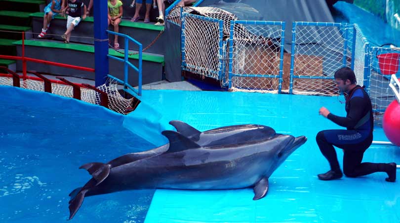Посещение дельфинария, который расположен в Адлерском районе, в Курортном городке. В день дается 3-4 представления. Кстати дельфинов можно увидеть не только в дельфинарии, иногда они проплывают и вдоль пляжей.